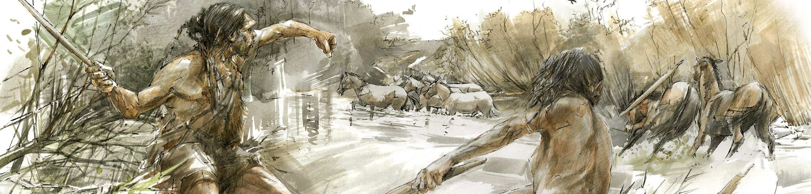 Even wildhorses were hunted with spears. Reprint of a watercolor by Benoît Clarys (2018)