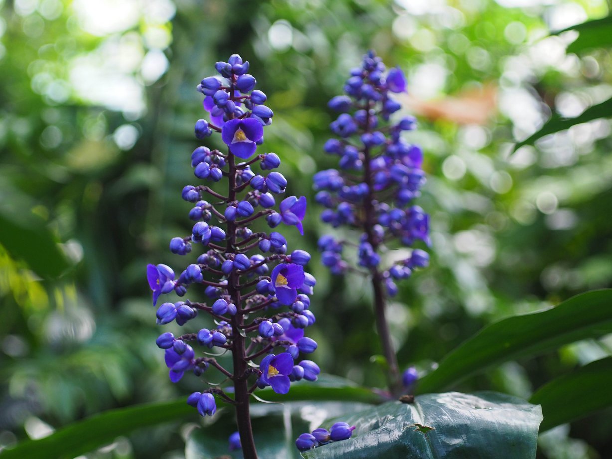 Der Blaue Ingwer ist tatsächlich gar nicht mit dem Ingwer verwandt, aber das Erscheinungsbild der Pflanze erinnert schon etwas an die Ingwerverwandtschaft. Als Vertreter der Tagblumen- und nicht der Ingwergewächse stehen die Blätter schraubig am Stängel, der bis zu 2 Meter hoch werden kann. Gerade büht die Pflanze im Südamerikabereich im Tropicarium. Die prächtigen, blauen Blütenrispen stehen aufrecht an der Spitze der Pflanze und die Einzelblüten öffnen sich nach und nach. Typisch für den Verwandtschaftskreis ist die Dreizähligkeit der Blütenorgane. Besonders auffällig sind bei dieser Art die inneren drei tief-blauvioletten Perigonblätter und die sechs leuchtend gelben Staubblätter.