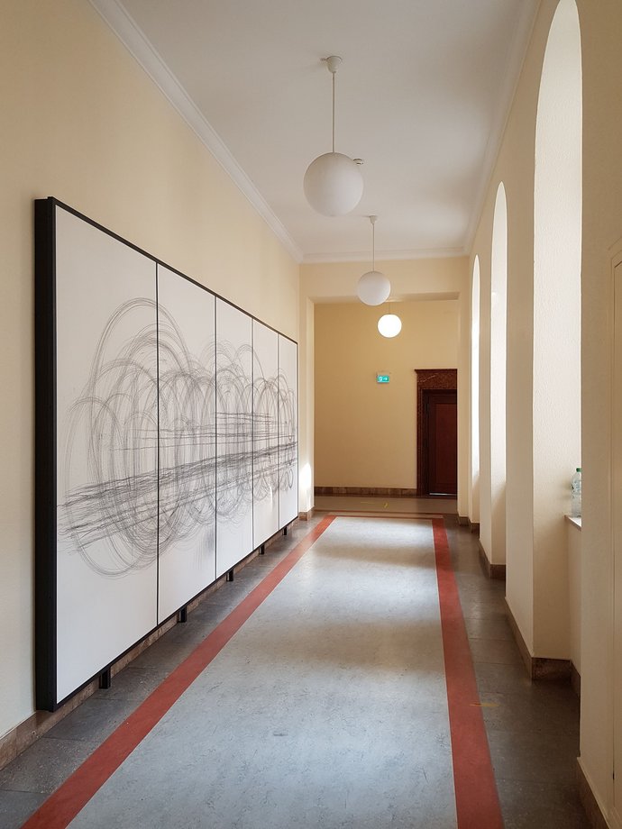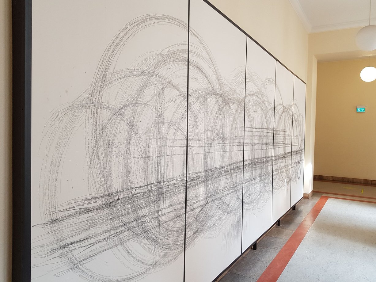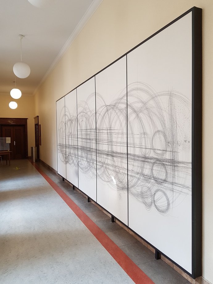 Wir freuen uns sehr, dass das zunächst als ephemeres Werk geplante große Wandscribbling, das unsere letzte Invited Artist, Morgan O'Hara aus New York, mit Ihren Studierenden an die Wand im Kabinettraum des MUT | Alte Kulturen im Schloss gezeichnet hat, nun von Stephan Potengowski in die Neue Aula transferiert werden konnte. Wir freuen uns umso mehr darüber, als wir ja das Invited-Artist-Programm im vergangenen Sommer aussetzen mussten – und Rektor Bernd Engler die Idee hatte, das große Bild vom WS 19/20 dauerhaft in der Universität zu präsentieren.
