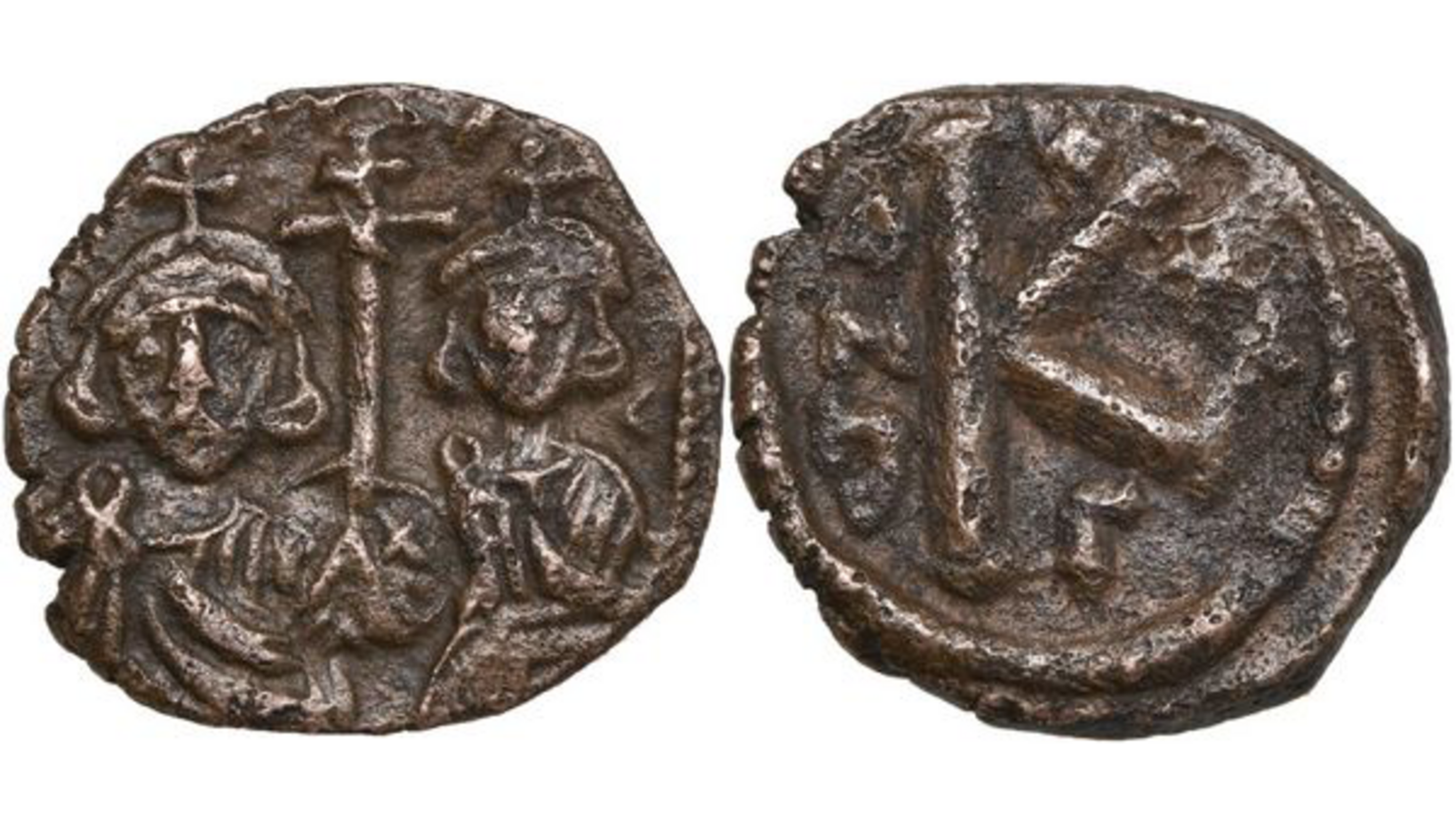 Bei der Münze des Monats März handelt es sich ausnahmsweise um eine byzantinische Prägung. Die Kenntnis auch solcher Münzen ist in der islamischen Numimsatik angeraten und seit Anfang 2024 ist an der FINT nun auch ein größerer, bunter Bestand byzantinischen Geldes verfügbar. Als attraktive Rarität darf dabei ein Konstantinopeler Halb-follis Kaiser Justinians II. (Rhinotmetos „mit abgeschnittener Nase“) gelten, welcher sich insbesondere mit dem expandierenden Umayyaden-Reich auseinandersetzen musste. Die kleine Kupfermünze stammt aus seiner zweiten Regierungszeit von 705 bis 711 und zeigt ihn zusammen mit seinem Sohn und Mitkaiser Tiberios, wobei beide einen Reichsapfel mit Patriarchenkreuz und der Inschrift PAX („Frieden“) halten.