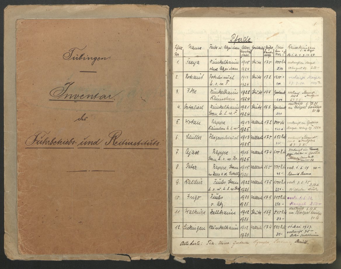 In regelmäßigen Abständen stellen das Universitätsarchiv und die Universitätsbibliothek Tübingen Highlights und interessante Objekte aus ihren Sammlungen vor. Beim Objekt des Monats November 2025 handelt es sich um das Inventar des Reitinstituts von 1929.