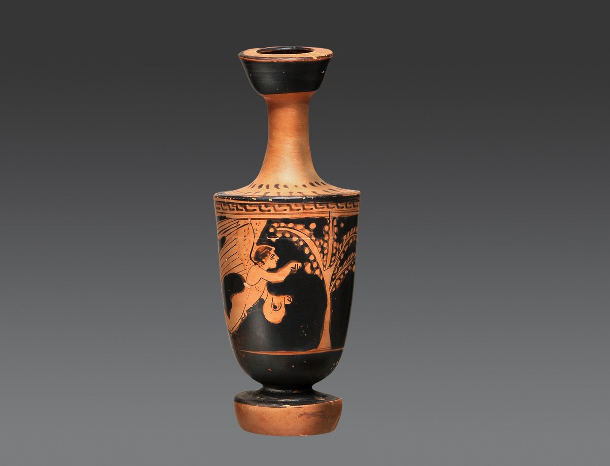 „…wie der Süßapfel errötet auf hohem Ast, / hoch auf dem höchsten; ihn vergaßen die Apfelpflücker / - doch nein, sie vergaßen ihn nicht: vielmehr waren sie nicht imstande, ihn zu erreichen.“ So lauten drei berühmte Zeilen aus einem Hochzeitslied der Dichterin Sappho, die um 600 v. Chr. auf der Insel Lesbos lebte, eine Hochburg griechischer Lyrik. Wir werden wohl nie erfahren, was – oder vielmehr wer – in ihren Zeilen mit dem Apfel verglichen wurde, der auf seinem hohen Ast errötend zur Reife erstrahlt. Die Spur des Apfelpflückens als erotische Metapher geht bekanntlich bis zu Adam und Eva zurück. Sie führt aber auch in die Vasensammlung im Museum Alte Kulturen auf Schloss Hohentübingen, wo das Motiv ein Tonfläschchen ziert. Wie eine Biene an der Blüte schwebt hier der Liebesgott Eros an einem Baum und ist offenbar damit beschäftigt, seine Ausbeute in eine Henkeltasche zu befördern, die er über dem linken Unterarm trägt.