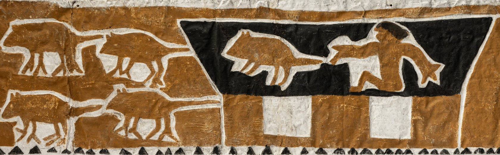 Ein Boot, ein Baum, ein Haus, zwei streitende Frauen – und dazwischen: Ratten und Katzen. Die Geschichte, die dieser bemalte Gipsabguss erzählt, stammt aus Palau, einem Inselstaat im westlichen Pazifik. Sie ist Teil einer palauischen Erzähltradition in Form von kunstvollen Holzschnitzereien an den Querbalken der sogenannten bai – Männer-Versammlungshäuser. Der hier zu sehende Ausschnitt zeigt einen Teil des bemalten Gipsabgusses, den die Künstlerin und Ethnologin Elisabeth Krämer-Bannow (1874–1945) auf der Insel Babeldaob (heute Bundesstaat Ngaraard) anfertigte.
