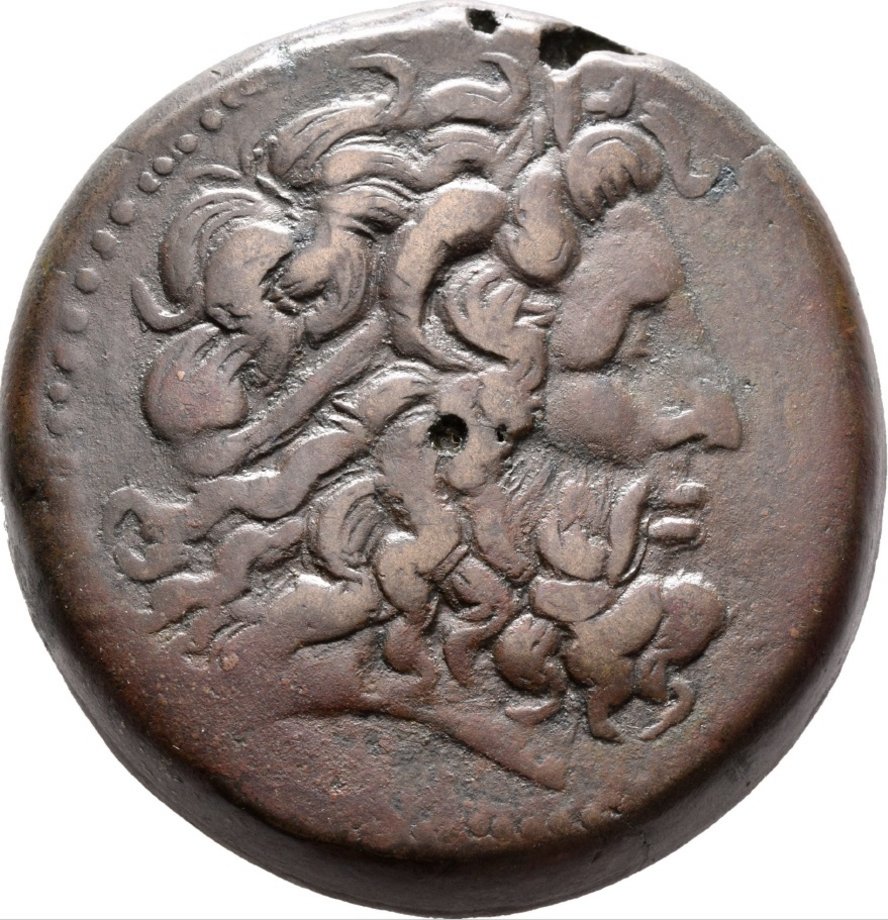Die Vorderseite zeigt den Kopf des Zeus Ammon, die Gleichsetzung des altägyptischen Sonnengottes Amun mit Zeus. Auf der Rückseite steht ein Adler, das Symbol der ptolemäischen Herrscherdynastie, Bei der Prägung handelt es sich um eine Münze des Königs Ptolemaios III. Die kleine Vertiefung auf beiden Seiten der Münze ist ein sogenanntes Zentrierloch, das im Bearbeitungsprozess entstand.