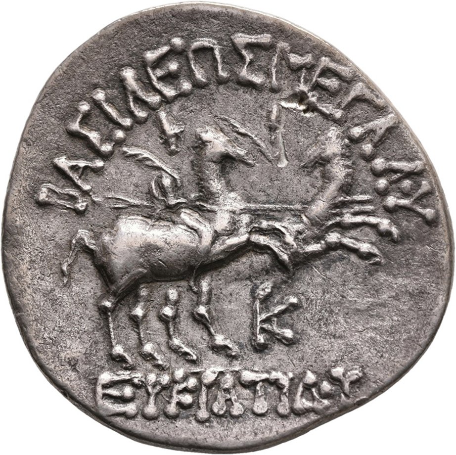 Auf der Vorderseite ist eine Büste des Königs Eukratides I. in Rüstung nach rechts abgebildet. Über seinem Diadem trägt der König einen mit einem Rossschweif geschmückten sogenannten Böotischen Helm. Die Rückseite zeigt die beiden Dioskuren Kastor und Polydeukes – nach unterschiedlichen Erzählsträngen in der griechischen Mythologie Halb- oder Zwillingsbrüder – mit Speeren und Palmwedel nach rechts reitend. Rechts unter dem Pferd ist ein aus griechischen Buchstaben zusammengefügtes Monogramm abgebildet. Um das Münzbild läuft die griechische Legende ΒΑΣΙΛΕΩΣ ΜΕΓΑΛΟΥ ΕΥΚΡΑΤΙΔΟΥ („das ist eine Prägung des mächtigen Königs Eukratides“).