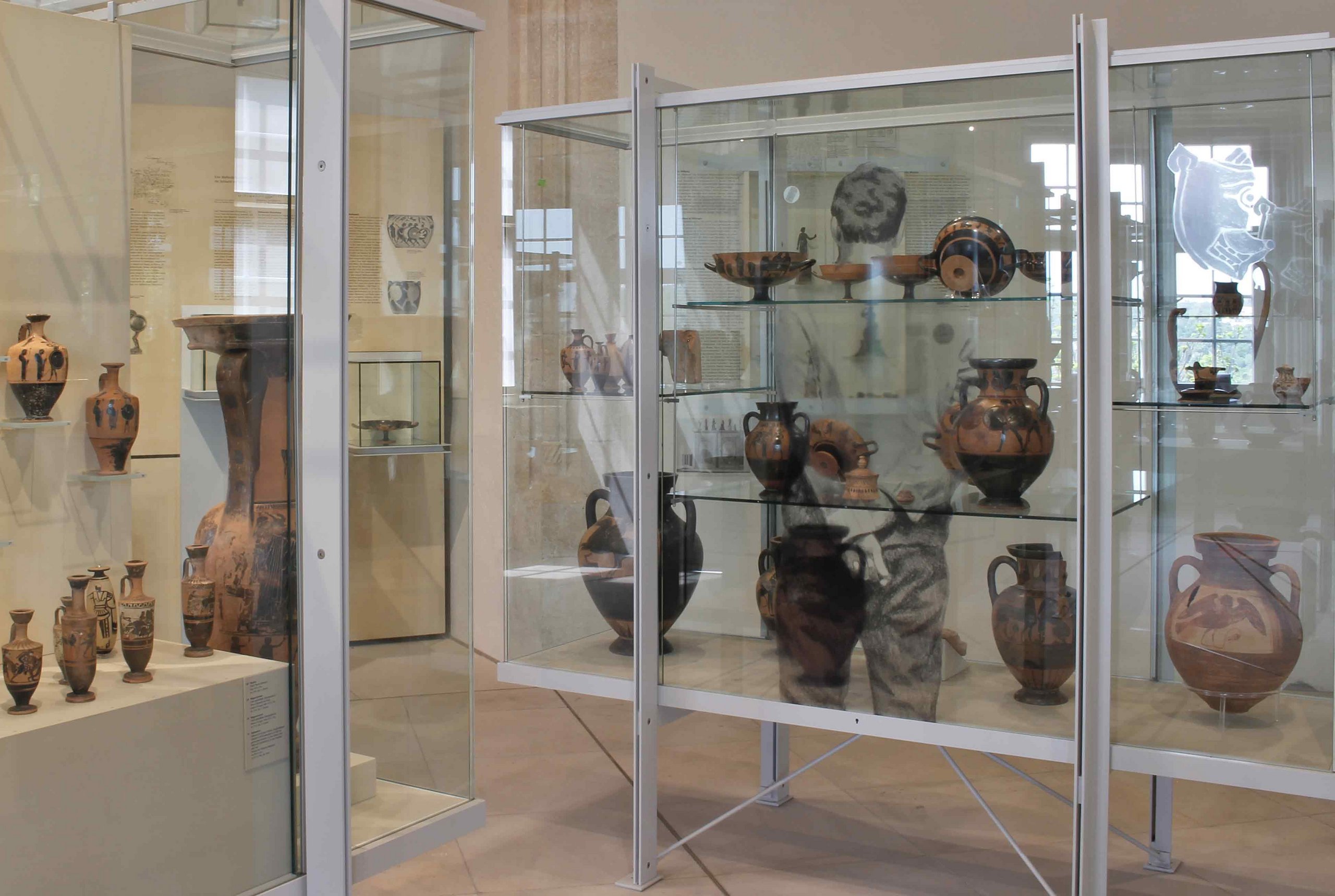 The special exhibition "LOOKING GLASS" is dedicated to this often ignored and yet blocking element. Artist Jonah Gebka uses the vitrine pane as a material ground for his exploration of the objects in the collection. Gebka's initial approach to the collections proceeded like a regular museum visit: an initial overview was followed by an examination of the departments, objects, and finally the staging. The artist was particularly preoccupied with the latter during his visit to the Round Tower, where objects from the Classical Archaeology collection are presented. As soon as one enters the room, one grasps it in its entirety. The symmetrical arrangement of the display cases also permits numerous "views through". In a subsequent visit by Gebka, who by now was strongly focused on the round tower, a special moment took place: The objects began to return the gaze. For the faces and eyes depicted on bowls, pictorial panels, and vase ornaments often look directly at the visitors, a nonverbal dialogue begun millennia ago. Between this exchange, however, there is always the separating element of the glass plate, the display case.
