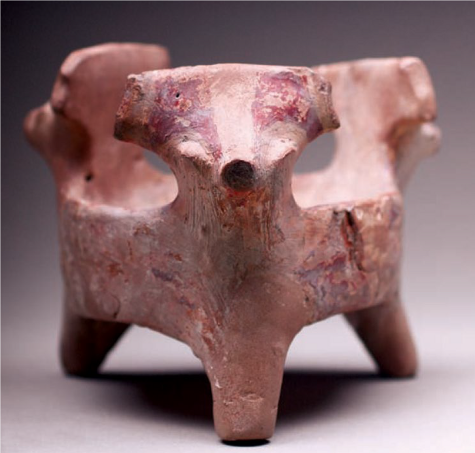 [Translate to Englisch:] Gefäß auf drei Beinen mit stilisierten Tierköpfen, rötlich-braun mit Spuren von Bemalung
